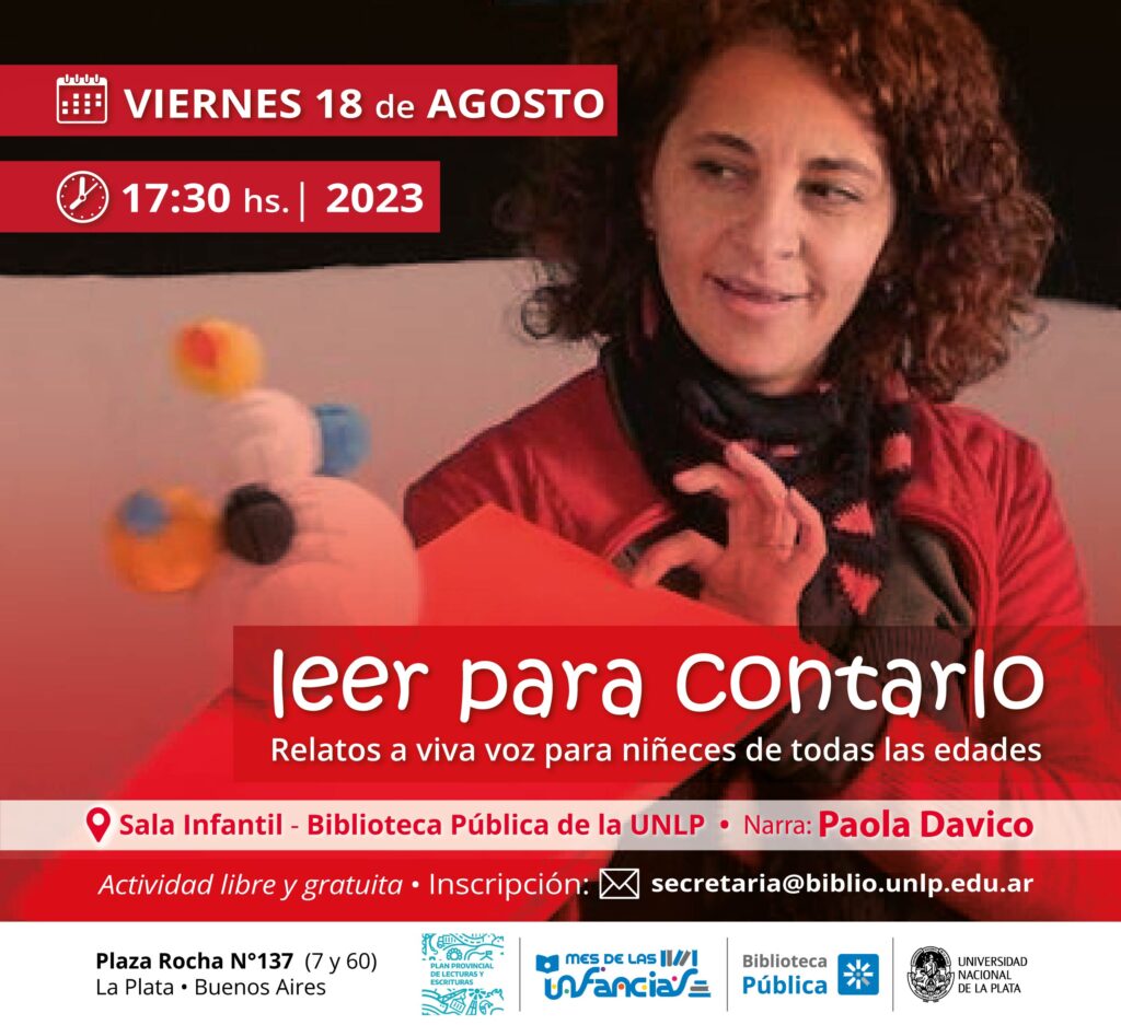 La Biblioteca Pública de la UNLP desea que la comunidad local conozca y visite su Sala Infantil. Este VIERNES 18 de agosto a las 17:30 hs. -en el marco de la celebración del “Mes de las Infancias”- invitamos especialmente a todas las familias a que vengan a disfrutar de la lectura de leyendas y cuentos narrados por la docente Paola Davico, coordinadora del Plan Provincial de Lecturas y Escrituras.